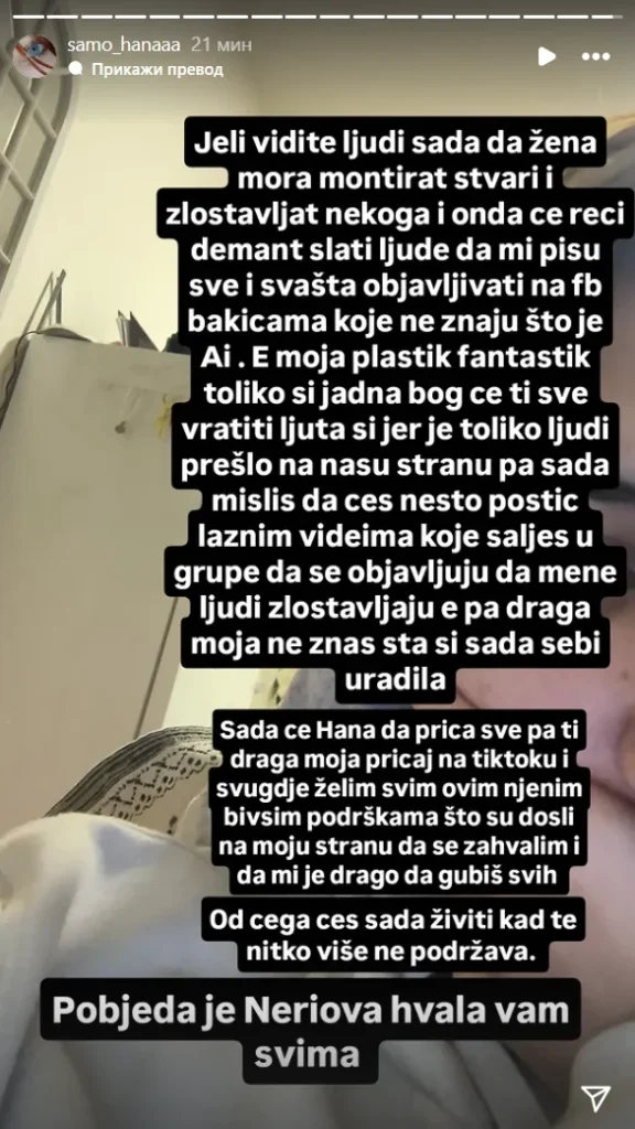 - Sada će Hana da priča sve, pa ti daraga moja pričaj na Tiktoku i svuda gde želiš, svim onim bivšim podrškama što su došli na moju stranu. Drago mi je što gubiš sve, od čega ćeš sada živeti kad te niko ne podržava. Pobeda je Neriova, hvala svima.