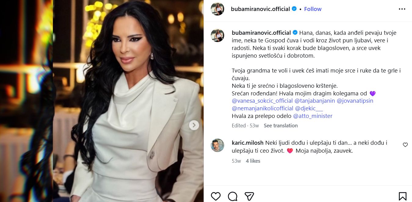 Nedavno je na porodičnom slavlju povodom ženidbe sina okupila brojne kolege sa estrade, što je izazvalo pozitivne komentare u javnosti. Iako je napunila 59 godina, Buba Miranović i dalje odiše energijom i šarmom, a njene objave na društvenim mrežama pokazuju da je i dalje rado viđena među publikom.