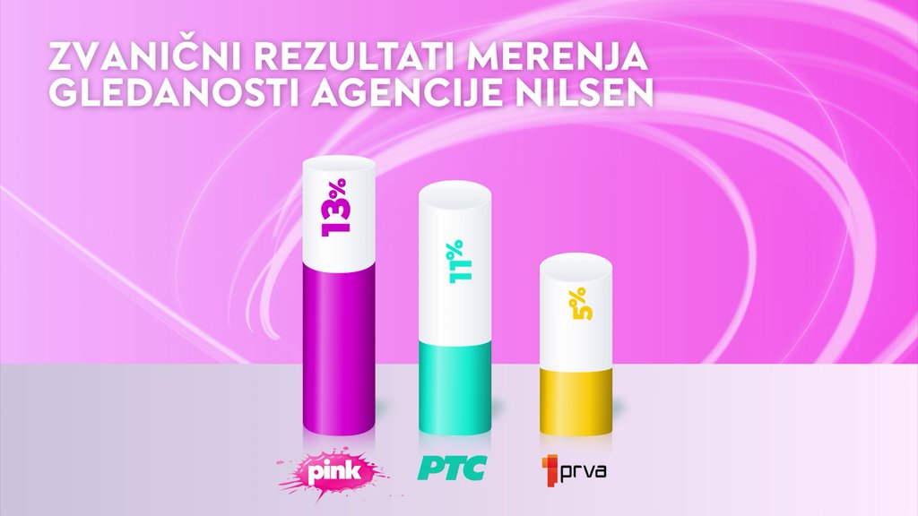 Prema najnovijim zvaničnim podacima agencije Nilsen o gledanosti, televizija Pink je i tokom jučerašnjeg dana zauzela vodeće mesto među svim televizijskim stanicama u Srbiji. Pink je bila najgledanija u ukupnom zbiru, među ženskom publikom, kao i kod gledalaca starosti od 18 do 49 godina. Posebno se ističe da je u grupi ženske publike od 18 do 49 godina Pink takođe ostvarila vodeći rezultat, kao i među gledaocima iz Beograda i onima iz prestonice u pomenutoj starosnoj kategoriji. Uz to, Pink je među komercijalnim televizijama bio najgledaniji i kod urbane populacije.